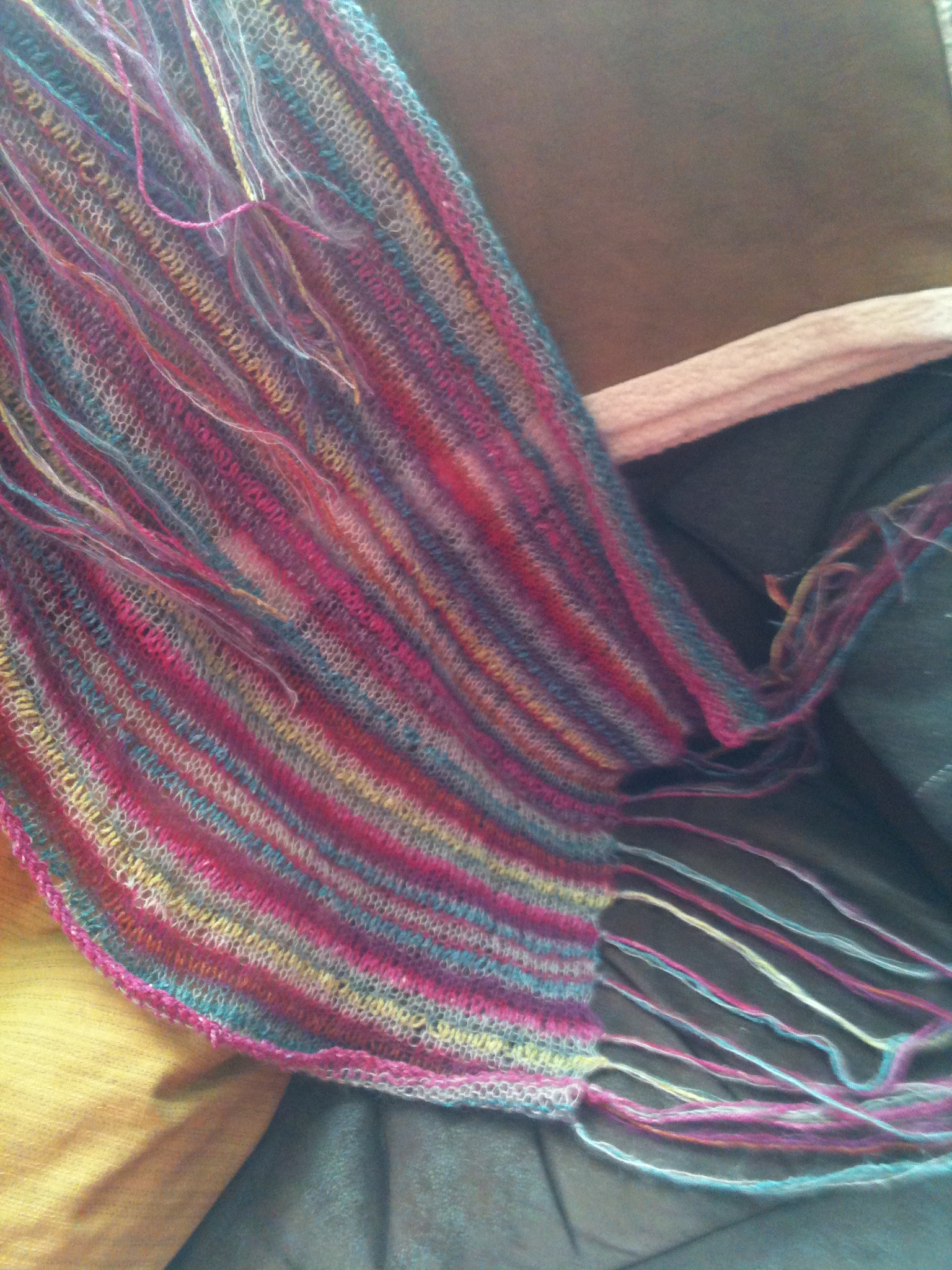 Im not very good with the titles lately. I don’t think I am going to reach my short term target straight away, however I have knitted the Unwind Wrap from Rowan Magazine 49. The pattern calls for 2 balls of Rowan Summer Tweed in one shade, one ball in four other shades and the same amount in Rowan Kidsilk Haze. I found I only used one ball of each shade and in all bar the first shade in KSH I used approximately half a ball so it’s a great pattern for using oddments up. It is the easiest pattern I have ever knitted. Even the fringing is easy, you just tie a knot every fourth row when you join a new shade in. I am almost up to the collar of the second side of Dominka and have knitted half of both sleeves of Vivienne