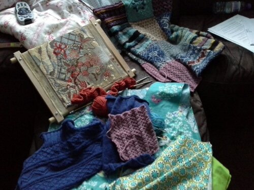 As well as this Glorafillia tapestry I have another smaller glasses case and a Felicity Hall cushion tapestry to finish. Some of my mystery blanket I have ripped back the red as I wasn’t happy with the way it was knitting. The blue sweater only needs sewing up, the blue and green is a skirt and the fabric in the back is a tunic that just needs hemming and the sleeves sewn in. I also have a few baby garments all cut out ready to sew as well as two summer tops and 2 pair of socks on the needle. There’s probably a lot more sewing projects cut out but I don’t want to think about that!
