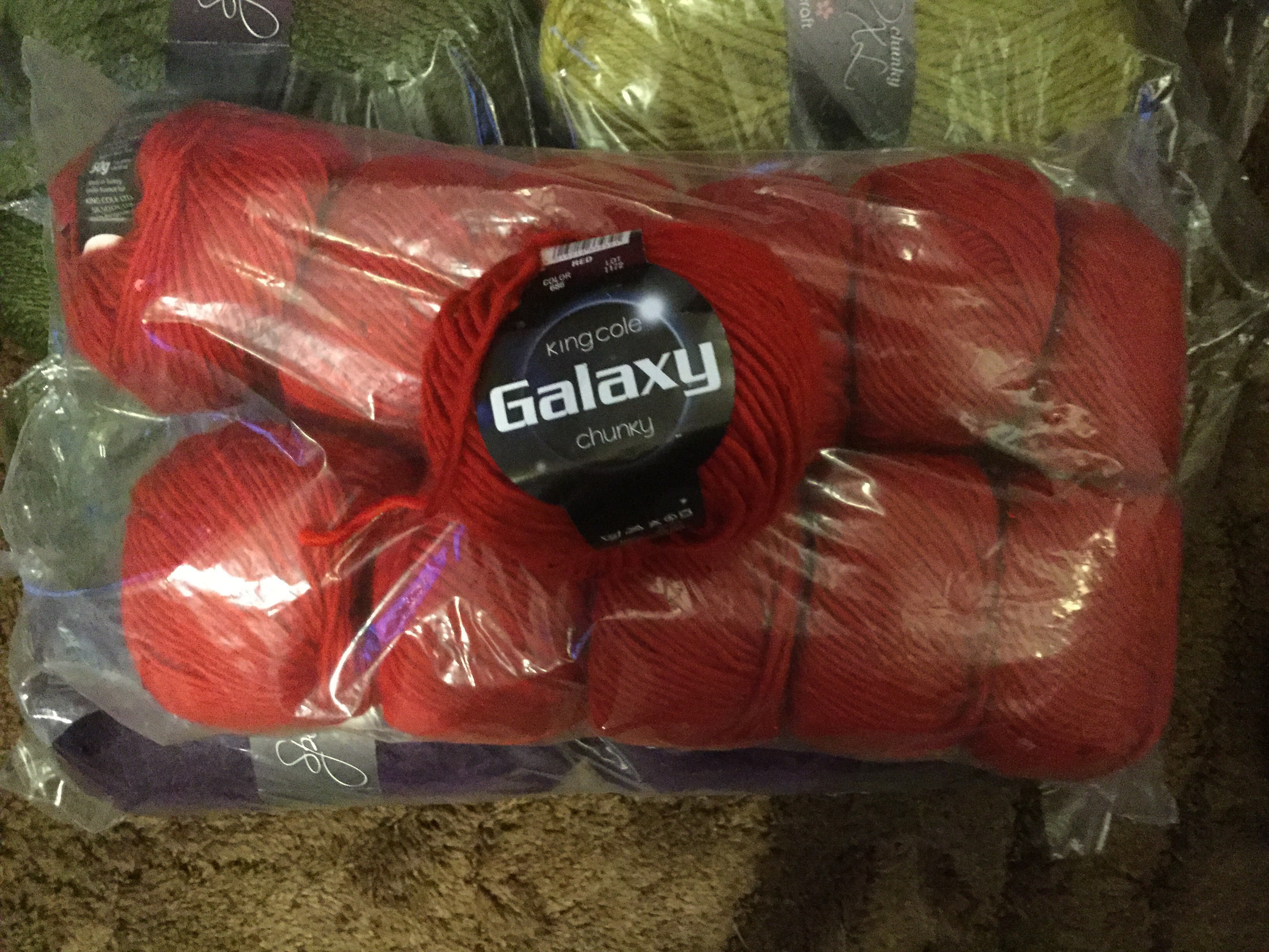 Harry yarn was next on the list. When I told Harry I was going to the knitting and stitching show, he asked me to get him some red yarn to knit him a sweater. As I have loads in the stash, I didn’t want to pay too much and I pounced on a bag of King Cole Galaxy chunky at Black Sheep yarns, it was only when photographing the yarn tonight, I realised I have made a boo boo. The yarn has sequins in it. Doh, I guess this is now Evalyns.