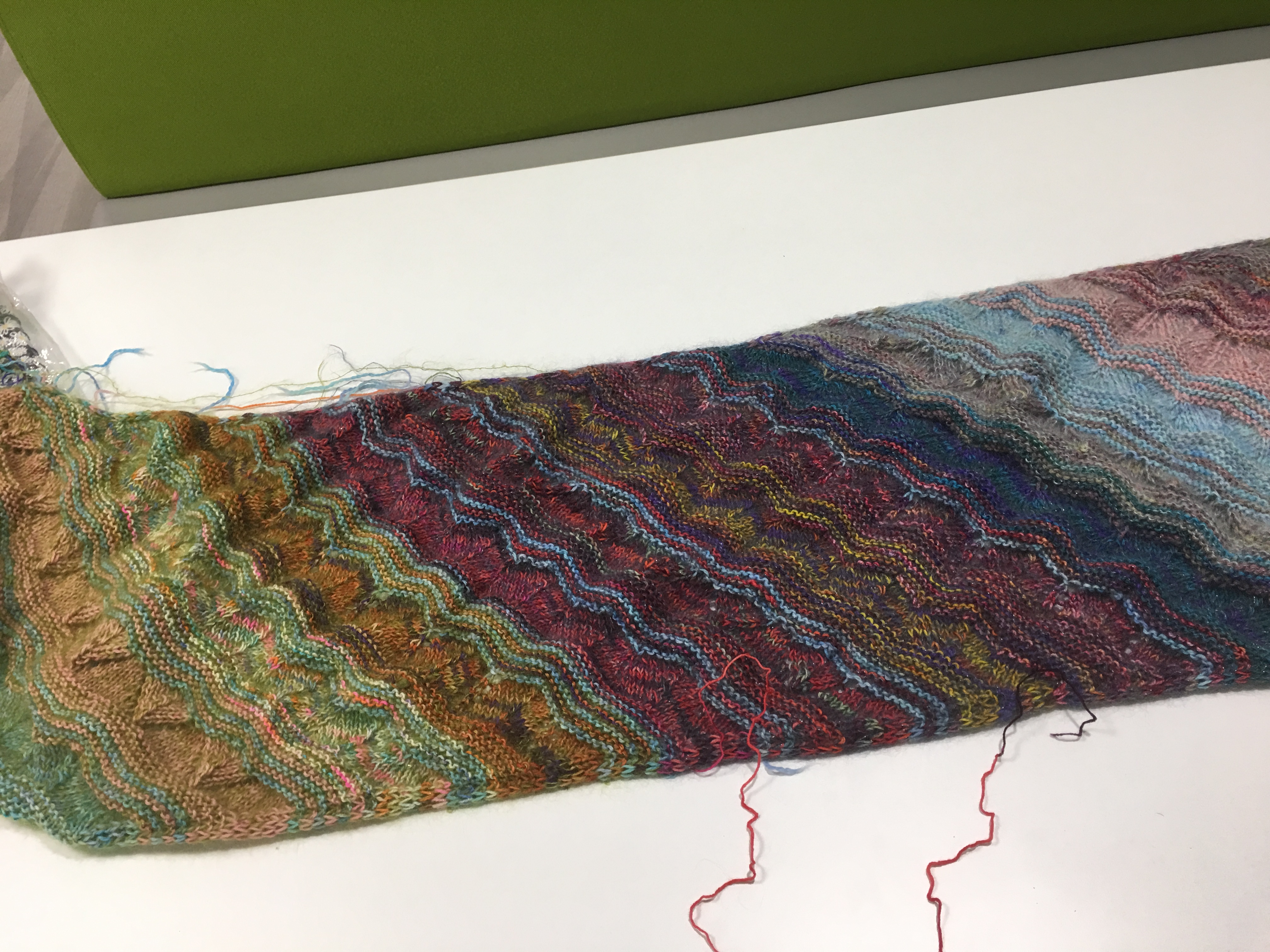 For the last section I am currently using Kidsilk Haze in lime green. I am loving how the different colours of Kidsilk haze creates a different effect giving the wrap an amazing riot of colour. Whilst enjoying this knit and observing the colours, it occurred to me this week that the reason I lost my knitting mojo was my colour choice. I love colour, strong, vibrant, jewel toned colours. I’ve never met a colour I didn’t like, although I am not a fan of pastel colours. As soon as I started knitting with the vibrancy of the sock yarn my mojo returned. This is a lesson learnt, when knitting for myself stick to the bright colours.