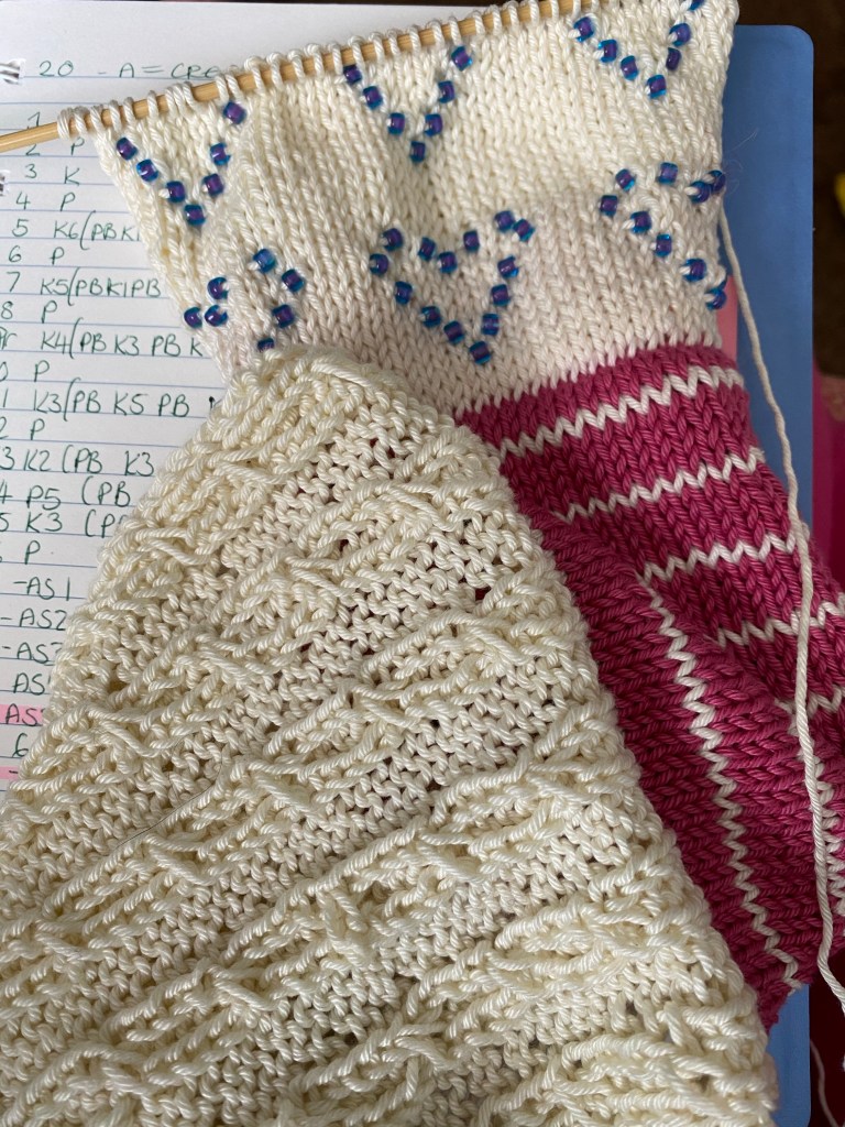 Strip four use the pink and a full ball of the cream for the first square, then cast off in pink but leave the cream attached and pick up stitches for square 2 using the same cream. Once this square is cast off pick up stitches for the third square and carry on using the cream. If you wish to you can thread beads for the fourth square at the start and push them to to middle of the ball and continue until end of square 5 using the same cream ball. I didn’t do this, however I used the cream yarn from square 6 of strip four to complete the strip.