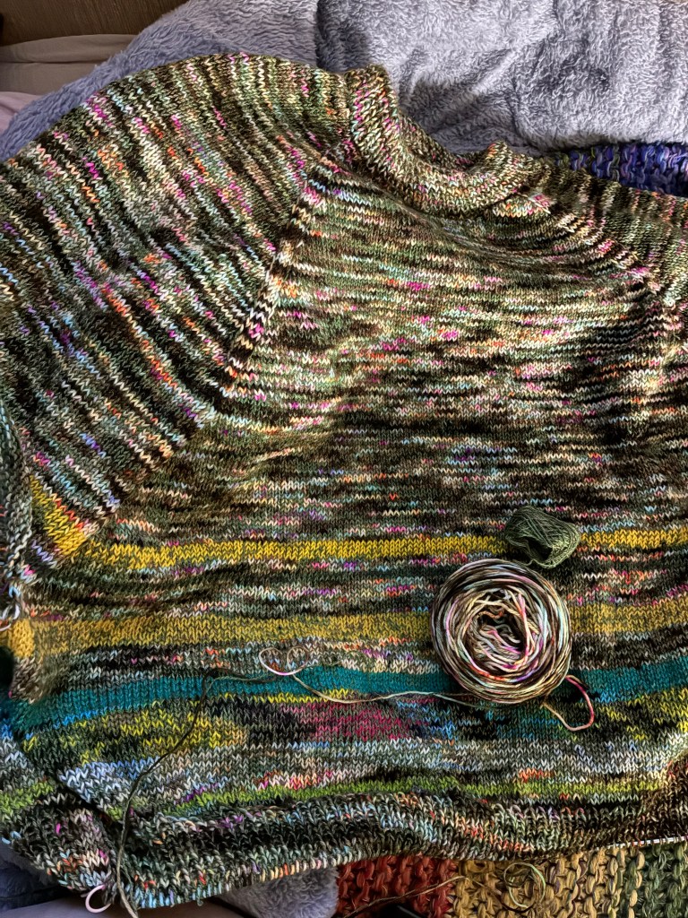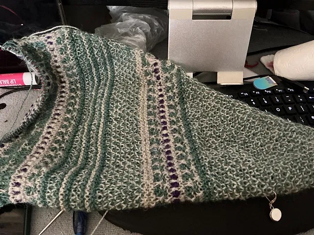 My final WIP is the wonderful Yara shawl. This is such a good pattern to follow and I am using the amazing Freehold Autumn yarn from stash as well as oddments where contrast is needed.